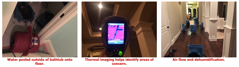 It was a two-story home located in a gated community along the Caloosahatchee River. One of the bathtubs on the second floor was inadvertently left on and overflowed. When the techs arrived water was pooled in the second floor bathroom and adjacent bedroom. Downstairs in the rooms below water was pouring from the ceiling, down the walls, and pooling on the hardwood floors.